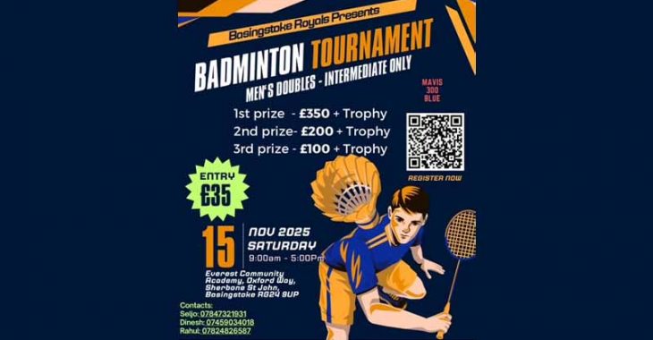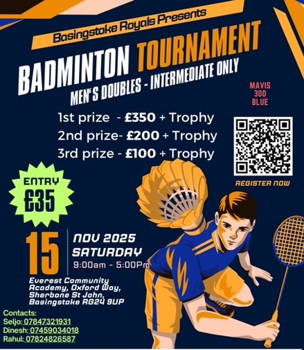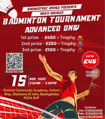 ലണ്ടൻ: ബേസിംഗ്സ്റ്റോക്ക് റോയൽസ് സ്പോർട്സ് ക്ലബ്ബിന്റെ നേതൃത്വത്തിൽ നടത്തുന്ന രണ്ടാമത് ആൾ യുകെ ബാഡ്മിന്റൺ ടൂർണമെന്റ് 2025 നവംബർ 15 ശനിയാഴ്ച രാവിലെ 9 മുതൽ വൈകുന്നേരം 5 വരെ ബേസിംഗ്സ്റ്റോക്കിലെ എവറസ്റ്റ് കമ്മ്യൂണിറ്റി അക്കാദമിയിൽ നടക്കുമെന്ന് സംഘാടകർ അറിയിച്ചു.