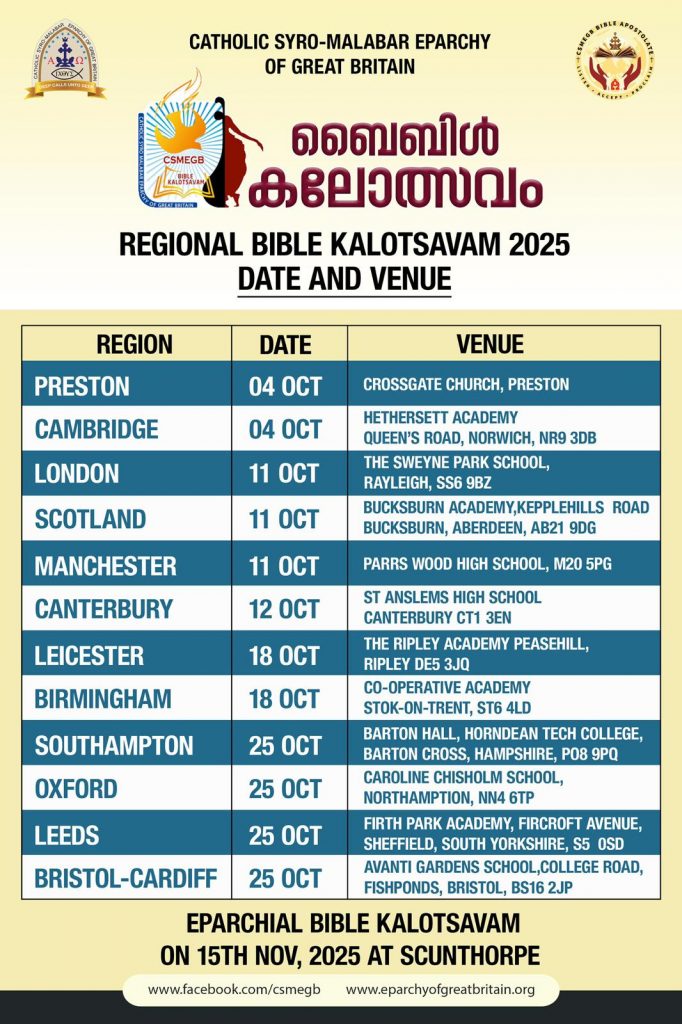 ഗ്രേറ്റ് ബ്രിട്ടൻ സീറോ മലബാർ രൂപത ബൈബിൾ കലോൽസവത്തിന് മുന്നോടിയായി നടക്കുന്ന റീജിയണൽ മത്സരങ്ങൾക്ക് ഇന്ന് തുടക്കം. രൂപതയിലെ പന്ത്രണ്ട് റീജിയണുകളിലെ നൂറിലധികം ഇടവകകൾ/മിഷനുകൾ / പ്രൊപ്പോസ്ഡ് മിഷനുകളിൽനിന്നുമുള്ള മത്സരാർത്ഥികളാണ് റീജിയൺ തല മത്സരങ്ങളിൽ പങ്കെടുക്കുന്നത്.