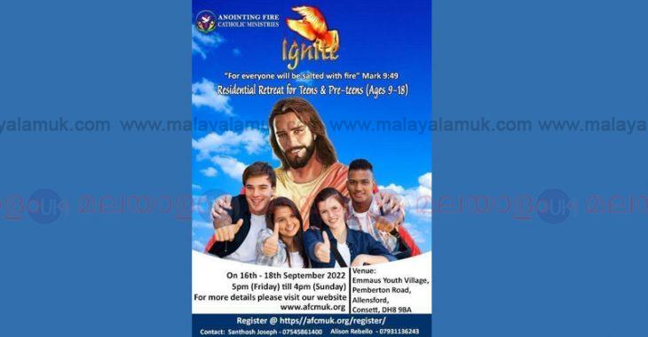 അഭിഷേകാഗ്നി കാത്തലിക് മിനിസ്ട്രിയുടെ നേതൃത്വത്തിൽ കുട്ടികൾക്കും ടീനേജുകാർക്കുമായി (9വയസ്സുമുതൽ 18 വരെ) 3 ദിവസത്തെ ധ്യാനം സെപ്റ്റംബർ 16 മുതൽ 18 വരെ അലെൻസ്ഫോർഡ് എമ്മാവൂസ് യൂത്ത് വില്ലേജിൽ വച്ച് നടക്കുന്നു ..