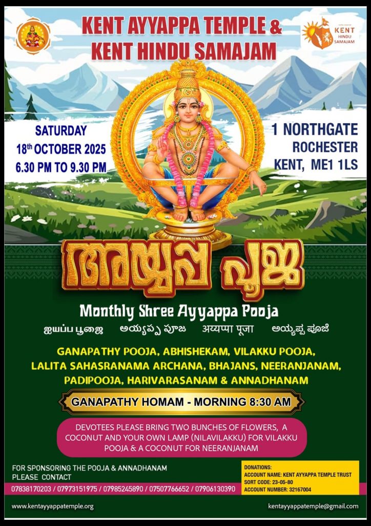 ഇംഗ്ലണ്ടിലെ കെന്റ് അയ്യപ്പ ടെംപിൾ കെന്റ് ഹിന്ദു സമാജത്തിന്റ തുലാം മാസ ശ്രീ അയ്യപ്പ പൂജ, (2025 ഒക്ടോബർ 18 ആം തീയതി ശനിയാഴ്ച) നടക്കും. രാവിലെ 8:30 ന് ഗണപതി ഹോമം, വൈകുന്നേരം 6:30 മുതൽ അഭിഷേകം, വിളക്ക് പൂജ, ലളിത സഹസ്ര നാമ അർച്ചന, ഭജന, നീരാഞ്ജനം, പടിപൂജ, ഹരിവരാസനം എന്നിവ നടത്തപ്പെടുന്നതാണ്, വിളക്ക് പൂജയിൽ പങ്കെടുക്കുന്ന ഭക്തർ രണ്ടു ബഞ്ച് പൂക്കളും, ഒരു നിലവിളക്കും, നീരാഞ്ചനത്തിന് ഒരു നാളികേരവും കൊണ്ട് വരേണ്ടതാണ്.ക്ഷേത്രം മേൽശാന്തി ശ്രീ അഭിജിത്തും, താഴൂർ മന ശ്രീ ഹരിനാരായണൻ നമ്പിടിശ്വരറും പൂജകൾക്ക് കർമികത്വം വഹിക്കും