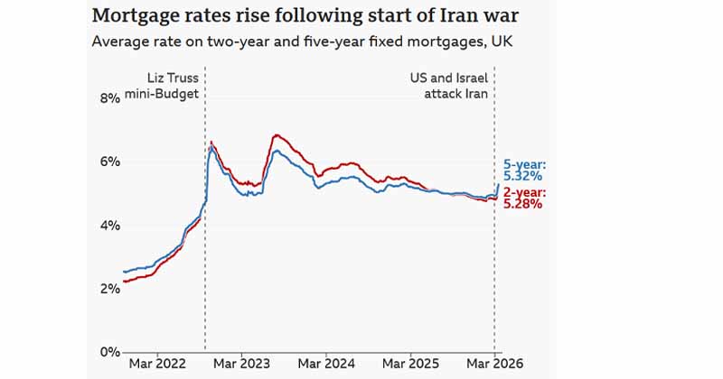 ഇറാൻ വിഷയവുമായി ബന്ധപ്പെട്ട് അമേരിക്കയും ഇസ്രായേലും നടത്തിയ സൈനിക നടപടികൾ യുകെയിലെ ഹൗസിംഗ് വിപണിയിൽ വലിയ പ്രത്യാഘാതം സൃഷ്ടിച്ചതായുള്ള റിപ്പോർട്ടുകൾ പുറത്തുവന്നു . പുതിയതായി എടുത്ത ഒരു സാധാരണ മോർട്ട്ഗേജിന്റെ വാർഷിക ചെലവ് വെറും രണ്ട് ആഴ്ചയ്ക്കിടെ തന്നെ ഏകദേശം £788 വരെ വർധിച്ചതായി മണിഫാക്സ് പുറത്തുവിട്ട കണക്കുകൾ വ്യക്തമാക്കുന്നു. 25 വർഷ കാലാവധിയുള്ള £250,000 മോർട്ട്ഗേജിന് ശരാശരി രണ്ട് വർഷ ഫിക്സഡ് പലിശനിരക്ക് 4.83 ശതമാനത്തിൽ നിന്ന് 5.28 ശതമാനമായി ഉയർന്നതും ഈ വർധനവിന് കാരണമായി.