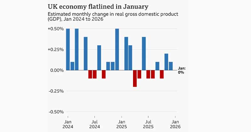 ബ്രിട്ടന്റെ സമ്പദ്‌വ്യവസ്ഥ 2026 ജനുവരിയിൽ പ്രതീക്ഷിച്ചിരുന്ന വളർച്ച കൈവരിക്കാതെ മന്ദഗതിയിലായതായുള്ള റിപ്പോർട്ടുകൾ പുറത്തുവന്നു . ഡിസംബറിൽ 0.1 ശതമാനം വളർച്ച രേഖപ്പെടുത്തിയിരുന്നെങ്കിലും ജനുവരിയിൽ ജിഡിപിയുടെ വളർച്ച നിരാശാജനകമായിരുന്നു . ഇതോടെ പുതിയ വർഷത്തിന്റെ തുടക്കം തന്നെ സമ്പദ്‌വ്യവസ്ഥയ്ക്ക് ആശങ്ക ഉളവാക്കുന്നതായി സാമ്പത്തിക വിദഗ്ധർ വിലയിരുത്തുന്നു. സേവന മേഖലയിലാണ് പ്രധാനമായും മന്ദഗതി പ്രകടമായത്. പ്രത്യേകിച്ച് ഹോട്ടൽ–റസ്റ്റോറന്റ് മേഖലയിൽ ആളുകൾ ചെലവ് കുറച്ചതോടെ ഭക്ഷണ-പാനീയ സേവന പ്രവർത്തനങ്ങളിൽ 2.7 ശതമാനം ഇടിവ് രേഖപ്പെടുത്തി. വർഷത്തിന്റെ ആദ്യ മാസങ്ങൾ ഹോസ്പിറ്റാലിറ്റി മേഖലയ്ക്ക് പതിവായി തന്നെ വെല്ലുവിളിയേറിയ സമയമാണെങ്കിലും ഈ വർഷം വ്യാപാര സാഹചര്യം കൂടുതൽ കടുപ്പമായിരുന്നുവെന്നാണ് ഈ വ്യവസായ രംഗത്ത് നിന്നുള്ളവർ അഭിപ്രായപ്പെട്ടത് .